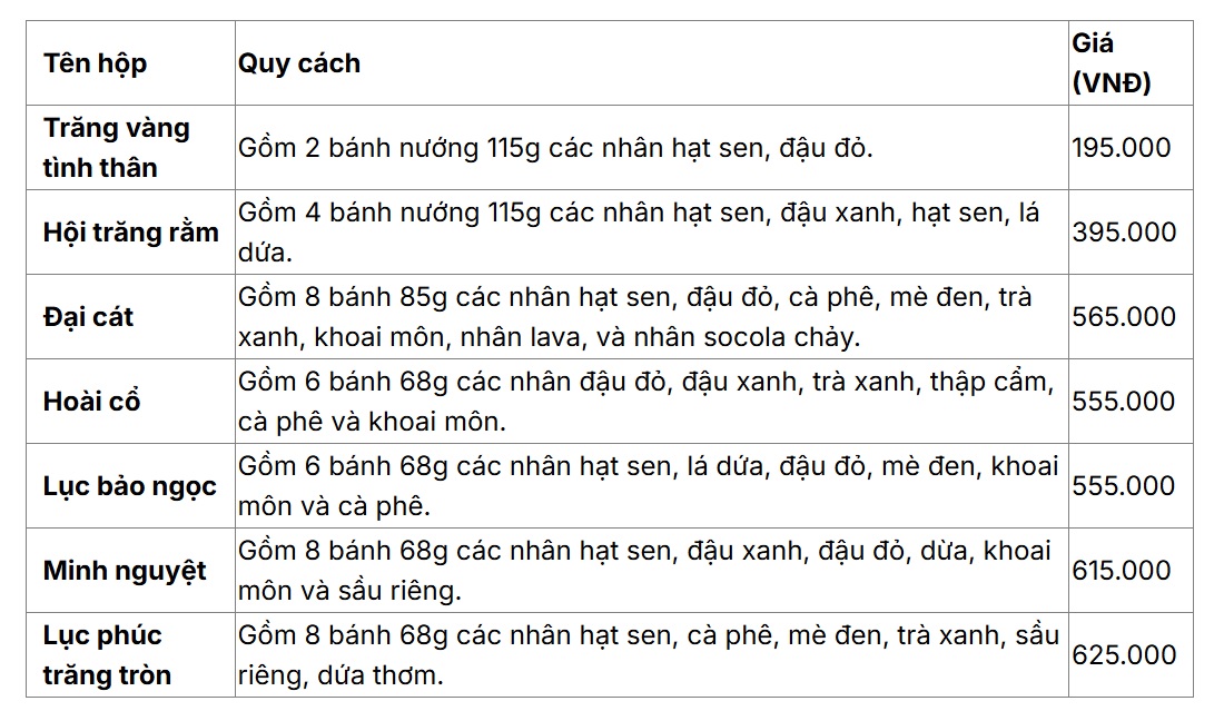 | Kinh Đô | 39.000 – 460.000đ | 250.000 – 1.500.000đ | Phổ biến – Trung cấp – Cao cấp (Trăng Vàng VIP) |